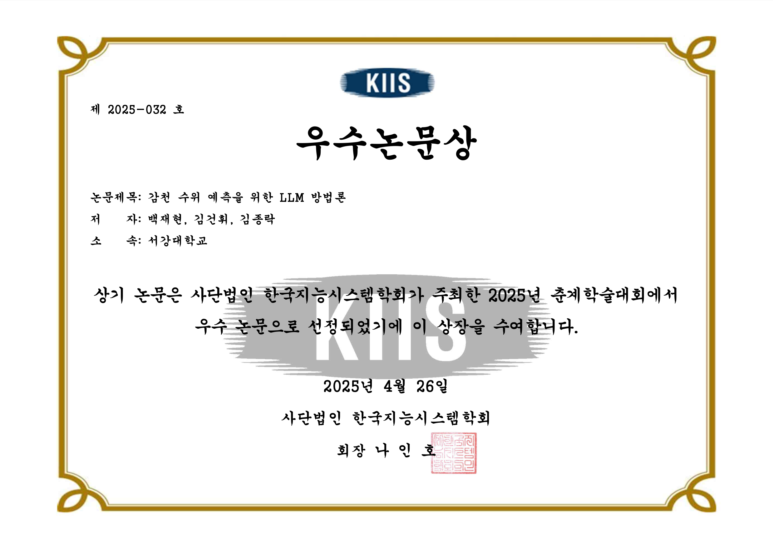 한국지능시스템학회 우수논문상, GS AI Commercial Festival 장려상, 서강대학교 Dean's List 선정 등 데이터 기반 모델링 역량과 AI 비즈니스 전문성을 인정받았습니다.