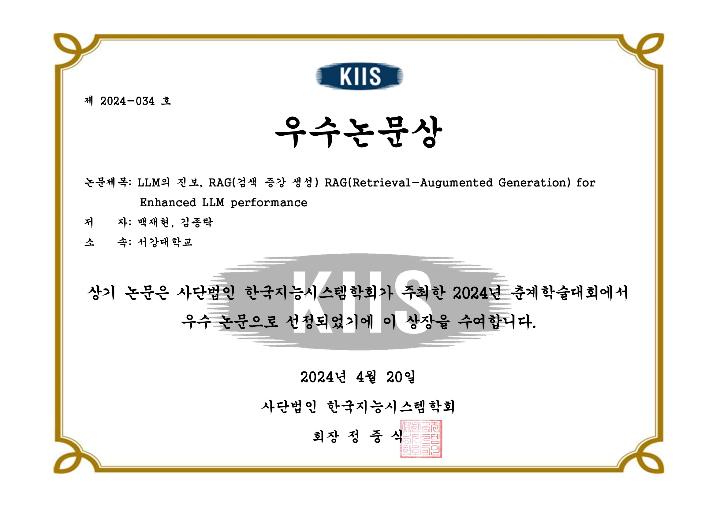 "RAG 기반 LLM 성능 최적화" 논문으로 우수논문상 수상